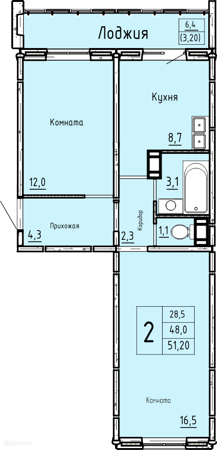 - Общая площадь: 51.2 м²