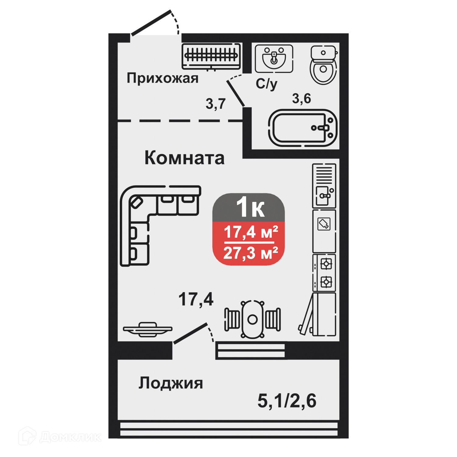 - Общая площадь: 27.3 м²