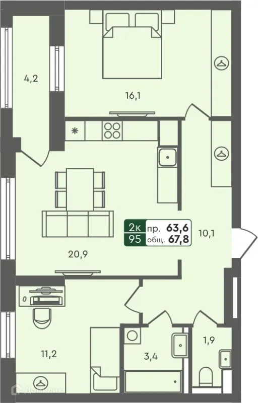 2 комн. квартира в Кургане в ипотеку от 57 536 руб/месяц