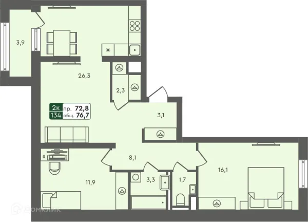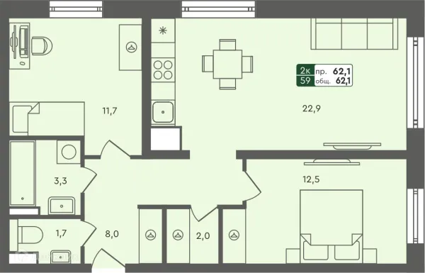 2 комн. квартира в Кургане в ипотеку от 61 640 руб/месяц